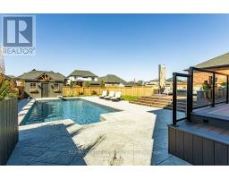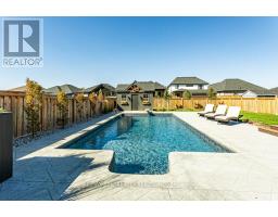 Welcome to 100 Foxborough Place. This 4 bedroom, 3 bathroom, executive 2 storey home is situated on a quiet residential street in Thorndale, a small town just east of London's city limits. This bright, open concept home is just 4 years young and offers not just a modern flow of function and form, but an exceptional outdoor retreat for kids and adults to play, splash and entertain in. The home welcomes you to a vast overhead double height ceiling allowing natural light to flood the hallway. On this floor, there is an office, powder room, living, kitchen and dining area all open to gleaming natural light beneath the 9 foot ceiling. The tones are blonde and neutral with engineered hardwood and black hardware. The focal point in the living space showcases a stone facade with electric fireplace centred by built in shelving banking either side. The kitchen boasts an island with square undermounted double sink, gas oven range, quartz counters, a pantry and plenty of soft close cabinets to store your kitchen contents. With 3 large patio door panels and back door off the large laundry area and mudroom, welcome to the WOW of the back yard. Your 16ft x 32ft heated, salt water in ground pool is surrounded by stamped concrete and raised, PVC decking. This beautiful sanctuary is fully fenced with a large shed to house all your pool equipment and outdoor items. On the second floor, you'll find the main bathroom, 4 good size bedrooms with the primary offering a large ensuite complete with standalone soaker tub, double sink vanity and shower with sliding glass doors. The basement is also 9feet and provides a canvas for you to finish and add value and additional recreation and living space. (id:47351)