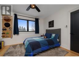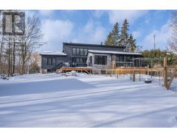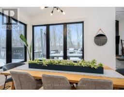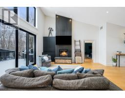 Set on a rare and private half-acre lot surrounded by mature Niagara Escarpment trees, this architecturally distinctive home offers refined country living with the feel of a modern cottage, without the commute to cottage country. Located on an exclusive street where homes rarely come to market, this is a truly special offering. Rebuilt in 2021, the home is designed to embrace its natural setting. The open-concept great room features soaring 16-foot vaulted ceilings, engineered natural hickory floors, and a striking floor-to-ceiling wood-burning fireplace. Expansive floor-to-ceiling windows span the rear of the home, with forest views and filling the space with natural light. When the trees are in full bloom, the home enjoys complete privacy. The chef-inspired kitchen showcases a custom Euro-style design with quartz countertops, quartz backsplash, and an impressive 10' x 4' island-perfect for entertaining while enjoying uninterrupted views of nature from every angle of the kitchen, dining, and living areas. The primary suite is privately located off the dining area and offers a peaceful retreat with a spa-like ensuite featuring a freestanding soaker tub, oversized glass shower, double vanity, and a large custom walk-in closet. A separate wing, tucked behind a pocket door off the living room, includes two spacious bedrooms and a beautifully finished 3-piece bathroom, ideal for family living or hosting guests. Outdoor living is exceptional, with professionally landscaped stone patios, tiered gardens, and multiple seating areas set against a serene backdrop. Completing the property is a attached garage with a finished second-level studio and storage, ideal for a home office, creative space, or gym. A rare opportunity to enjoy private, nature-inspired luxury on a highly sought-after street. (id:47351)