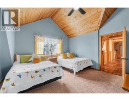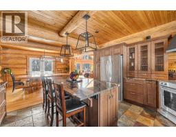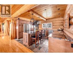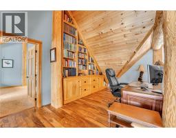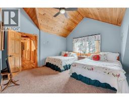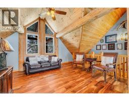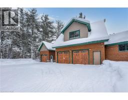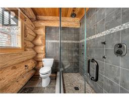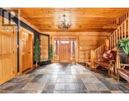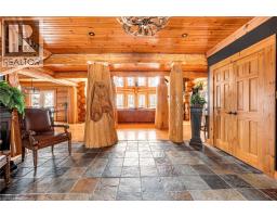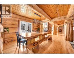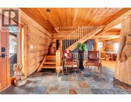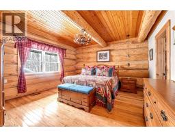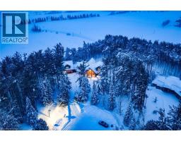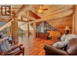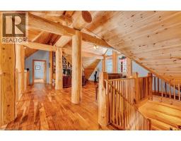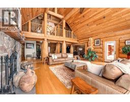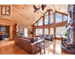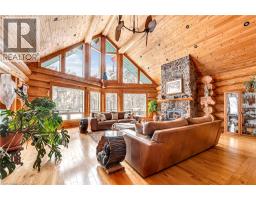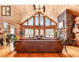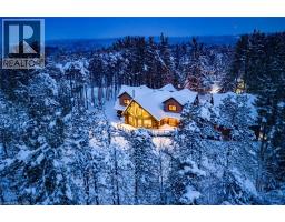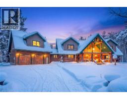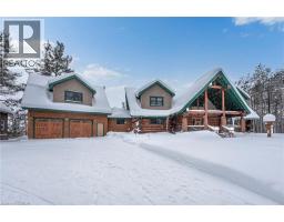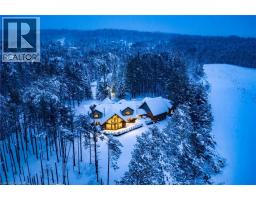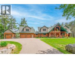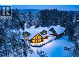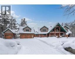 Set apart by timeless craftsmanship and natural beauty, this one-of-a-kind custom-built log home is privately situated at the end of a quiet cul-de-sac on 2.1 acres of mature, tree-lined grounds. This exceptionally unique residence boasts nearly 6,000 SF of refined living space that blends rustic elegance with modern comfort. Designed for both grand entertaining and everyday living, the home features 6 bedrooms and 4.5 bathrooms, complemented by an energy-efficient geothermal system and the low-maintenance beauty of hand-peeled Western Red Cedar. The stunning great room showcases soaring vaulted ceilings and a dramatic stone fireplace. This space flows seamlessly into a chef-inspired kitchen with granite countertops, stainless steel appliances, alongside a welcoming dining area ideal for intimate meals or large gatherings. The main-level primary suite features a private retreat complete with a walk-in closet and spa-like ensuite. Additional highlights include an upper-level den with scenic treetop views, beautifully appointed ensuite bedrooms for family and guests, and a radiant-heated lower level perfect for year-round entertaining or relaxation. An attached heated garage with smart openers is enhanced further by an impressive 650 SF loft making it ideal for a home office, studio, creative space or additional storage. Embrace the sights and sounds of the outdoors on the new 1,100 SF deck which spans the entire rear side of the home. The well-appointed grounds showcase professionally landscaped armour stone walkways and gardens as well as a detached 3rd garage. Delivering the perfect balance of privacy and convenience, this year-round retreat is located just a short drive from Barrie and only one hour from Toronto. With easy access to nearby lakes, trails, Horseshoe Valley Ski Resort, Vetta Spa, and other seasonal recreation destinations, this extraordinary property delivers an unparalleled lifestyle of comfort, beauty, and tranquility. (id:47351)