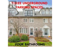 This outstanding executive townhouse with parking for 3 is ideally situated in the best block of Chateau By The Park. Built by Coughlan Homes & Spanning over 2,000 square feet across three generous floors plus a finished basement, the home features an open-concept main level with a formal dining room, a well-equipped kitchen and a family room complete with a gas fireplace. French doors open to a private west-facing deck, perfect for entertaining or unwinding. Upstairs, the second floor offers two large bedrooms-one with two walk-in closets & a four-piece bathroom, and a convenient laundry room. The entire third floor is dedicated to the luxurious primary bedroom suite, boasting a sitting area, a four-piece ensuite, his and hers closets, and a juliette balcony. The lower level provides a spacious recreation area, ample storage, a two-piece bathroom, and direct access to heated underground parking with two side-by-side spots at the door and an additional spot close by. Water tap for washing your car. Kitchen-Aid kitchen appliances are still under warranty, and recent upgrades include new two pc baths. Every level features a bathroom, and the property has very low annual heating and hydro costs. The complex is well maintained with all exterior maintenance-roof, doors, decks, tree replacement, and grass cutting-handled for you, supported by a large reserve fund for ongoing upkeep. Residents enjoy a range of amenities, including Rogers Xfinity cable, high-speed internet, water, parking, snow removal, landscaping, and exterior window maintenance included in the condo fees. The community offers a newly renovated party room for gatherings and a private mailroom for convenience, as well as abundant visitor parking and easy access to transportation and shopping, including quick entry to Highway 401. This well-appointed home presents a unique opportunity for spacious, comfortable, and maintenance-free living in a prime location. Be sure to click through the virtual tour (id:47351)
