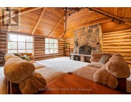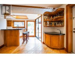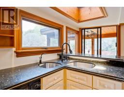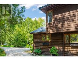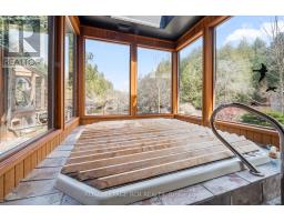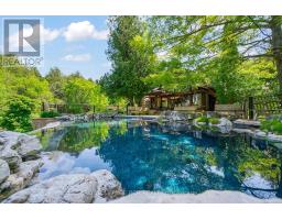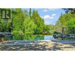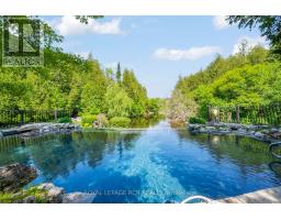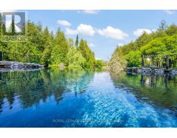 Tucked away on a secluded road, 15 River Bluff Path offers an extraordinary sanctuary blending natural beauty, creative energy, and quiet seclusion. Set on 13 acres with over 750 feet along the Eramosa River, this property presents a once-in-a-lifetime opportunity, with many unique features grandfathered in by the GRCA. The winding drive leads through a forest of mature trees to an almost otherworldly scene where a breathtaking infinity pool appears to spill into the river, surrounded by tranquil vistas and lush vegetation. Enjoy the scenery from the tiered deck, relax in the indoor hot tub, or watch wildlife such as deer, herons, and turtles. The private trail system leads to whimsical outbuildings, including a screened wooden pergola, a Japanese Maple Zen garden, and an outdoor privy. Once owned by a renowned Canadian naturalist, the property brims with creativity and inspiration. Inside, the great room captivates with soaring ceilings, stained glass accents, rustic wood beams, and a dramatic gas fireplace. A wall of windows connects the indoors to the breathtaking river view. The adjoining dining nook is perfect for gatherings, while the spacious kitchen features ample storage, a skylight, and an iconic AGA gas cooker. The main floor includes a vaulted-ceiling bedroom, a dressing/hobby room, two three-piece bathrooms (one wheelchair accessible), and a large laundry room. Upstairs, a loft-style theatre room provides an ideal space for entertainment, and two additional bedrooms share an impressive four-piece bathroom with heated floors and a spacious walk-in glass shower. With a two-car garage and an intercom system throughout, this retreat guarantees comfort and connectivity. Despite its privacy, it's just minutes from Rockwood's amenities and easily accessible to Guelph, Milton, and Pearson Airport. 15 River Bluff Path is more than just a home - it's a legacy property rooted in nature and creativity, where every moment feels extraordinary. (id:47351)