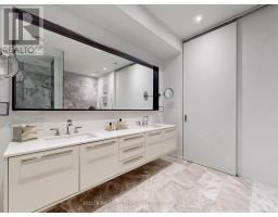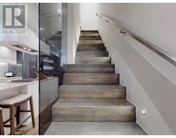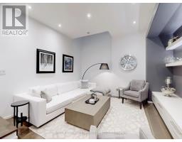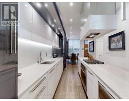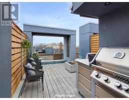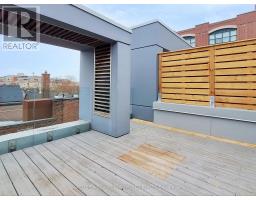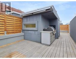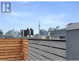 An exceptional multi-level residence offering refined interiors, premium finishes, and a private rooftop terrace with skyline views. The rooftop terrace includes wood decking, glass enclosure for barrier-free city views, wood privacy fencing, covered barbecue and seating areas, and views of the downtown skyline including the CN Tower. The main floor features brushed oak flooring and 10-foot ceilings. The foyer offers a walnut paneled door with glass inset and frosted transom, and a guest closet. The open-concept dining room overlooks the front grounds through a floor-to-ceiling window and includes pendant lighting, built-in accent shelving with feature lighting, lower cabinetry, and a Sub-Zero dual-temperature wine fridge. The kitchen showcases stone countertops, glass backsplash, valence-lit cabinetry, Sub-Zero fridge/freezer, Asko dishwasher, a centre island with stone waterfall countertop, Wolf four-burner cooktop, Wolf oven, Panasonic built-in microwave, and seating for two. The living room features a skylight and built-in shelving with lower cabinetry. The second level offers a primary suite with floor-to-ceiling window wall, built-in desk and dresser, dressing quarters with mirrored cabinetry, and a marble-floored ensuite with double floating vanity, water closet, soaker tub, and glass-enclosed shower with rain head. The third level includes two bedrooms, one with a Romeo and Juliette balcony. New roof (2026) at seller's expense. Nearby local parks, including Trinity Bellwoods Park and Stanley Park. Within walking distance to a multitude of cafés, boutique shopping, dining and fitness studios along Queen Street, only steps to public transit. A short drive to STAKT Market and The Well, with easy access to Osgoode and King West. (id:47351)