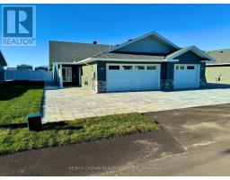 Discover Your Dream Home on the Kapuskasing Golf Course! Welcome to your new home, nestled beside the serene 8th hole of the Kapuskasing Golf Course. This newly built residence, backed by a warranty, is perfect for those who wish to enjoy their summers right on the green. As you arrive, you'll be greeted by a beautifully paved stone driveway leading to the entrance. Step inside to an open concept living space adorned with pot lights, creating a bright and airy ambiance. Both bedrooms are located at the back of the home, offering tranquil views of the golf course. The master bedroom features air conditioning and a walk-in closet, while the second bedroom includes a convenient closet with access to the laundry area and the home's air exchanger. The living room is equipped with air conditioning and ready hookups for internet, cable, and telephone. From the main entrance, you have direct access to your attached garage, which houses a 100-amp electrical breaker panel, a 2-in-1 boiler providing in-floor heating for both the home and garage, and a mud sink. The exterior of the home is finished with CanExel siding and stone, complemented by pot lights in all soffits for excellent nighttime illumination. Home boasts a private backyard with an 8x12 shed, perfect for parking your golf cart, ready to drive directly onto the course. The back of the home also features a natural gas hookup for your BBQ. These single-level homes are wheelchair accessible and designed for low maintenance, ensuring that this is the last move you'll ever need to make. Embrace a lifestyle of comfort and convenience at Kapuskasing Golf Course. (id:47351)