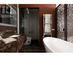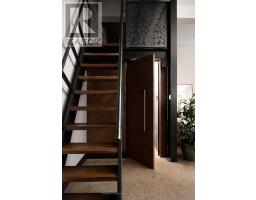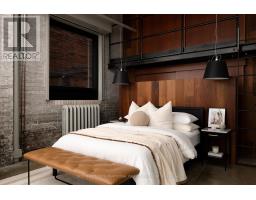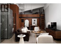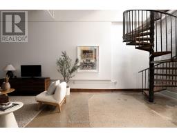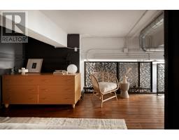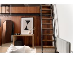Set within the former Evening Telegram building, this two-storey loft captures the clarity of authentic industrial architecture - open yet intimate, expressive yet composed. Designed to support both living and creative work, the space unfolds with quiet intention.The main level is defined by an open, fluid plan integrating the primary bedroom and ensuite, a flexible lounge, and a mezzanine alcove suited to reading or listening. Polished concrete floors and patinated steel establish a grounded architectural framework, softened by the warmth of the bedroom's custom Brazilian cherry headboard with integrated storage and full closet. The ensuite extends this sense of retreat through a restrained palette of veined marble radiant floors, perforated metal, and glass surround, shaping an atmosphere that feels calm, tactile, and restorative. Above, the kitchen, dining, and secondary living area flow together beneath a skylight that draws natural light across brick, black tile, and steel. A sculptural Ortal fireplace anchors the space-contemporary in form, timeless in presence-while polished concrete floors maintain continuity with the level below. A second bedroom and full bathroom complete the upper floor, offering flexibility for guests, work, or quiet retreat.Connected by a spiral staircase, each level also benefits from independent access, allowing the loft to move seamlessly between residential and creative use. A private rooftop terrace provides an outdoor counterpoint, and parking is included-an uncommon offering within this intimate heritage conversion.Balanced, deliberate, and quietly expressive, this loft brings past and present into alignment-a design-led space defined by light, material, and a distinct architectural presence. (id:47351)
