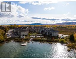 Welcome to Wyldewood Cove, where resort-style living meets the beauty of Georgian Bay. This stunning poolside suite features 1 bedroom plus a den, 2 full bathrooms, and bright, modern interiors throughout. Enjoy stainless steel appliances, ensuite laundry, and thoughtful finishes designed for comfort and convenience. Step out onto your private deck and enjoy your morning coffee, or relax on the expansive waterfront patio beneath the pergola while watching Collingwood's famous sunsets. Residents enjoy a year round heated outdoor pool, fully equipped gym, and change rooms. During the summer months, a dock is available for swimming, kayaking, and other waterfront activities. A private storage locker provides ample space for bikes, golf clubs, skis, and more. Ideally located with easy access to trails, golf courses, skiing, and all the amenities of Collingwood and Blue Mountain, this is carefree four season living at its finest. (id:47351)