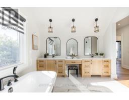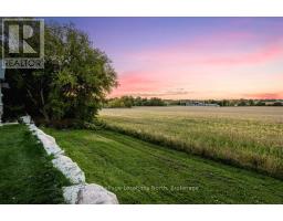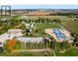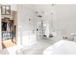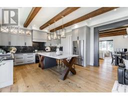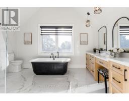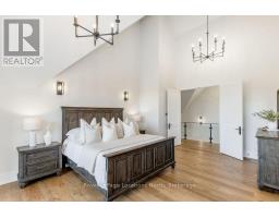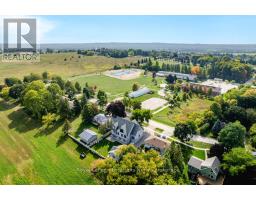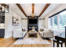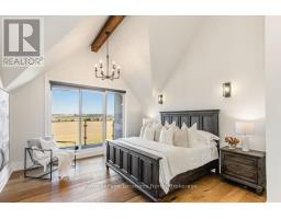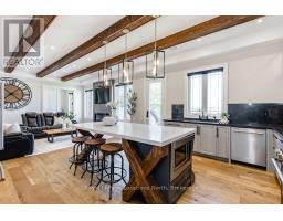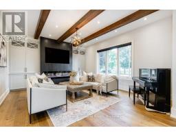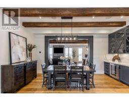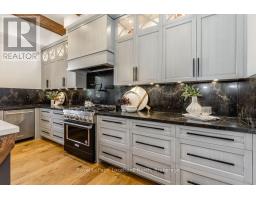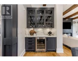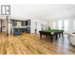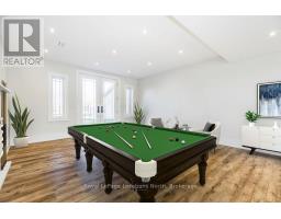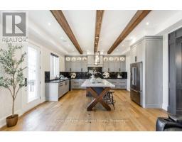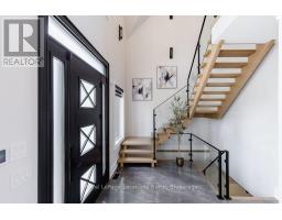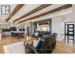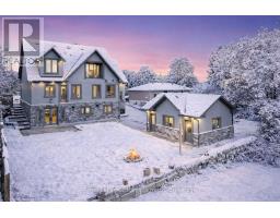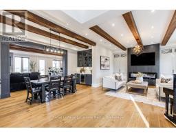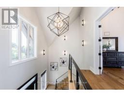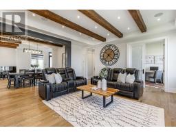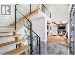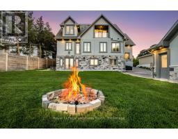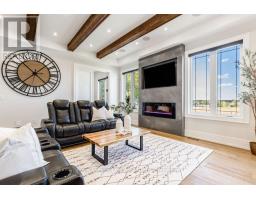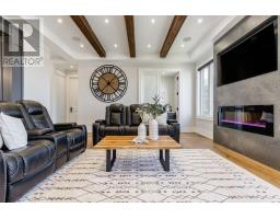 BACKS ONTO PROTECTED LAND. This stunning luxury home is situated on a quiet dead-end st, w/views of the countryside, + steps from park/rink/courts/library. This thoughtfully designed home offers an elegant, vibe, w/high end craftsmanship, featuring a stone + stucco exterior w/exceptional curb appeal. Upon entering, you are greeted by a grand entrance w/ heated porcelain tile floors, a custom wood staircase w/glass railing, + vaulted ceilings that create an inviting ambiance. The main level showcases engineered white oak flooring + exposed beam accents. The spacious living room offers custom-built cabinetry, a tiled feature wall with a built-in electric f/pl, + space for a TV. Adjacent is the elegant dining room, equipped w/ built-in cabinetry, dry bar, quartz counters, backsplash, +under-mount lighting perfect for entertaining. The family room flows directly from the dining room, offering a 2nd tiled wall w/ built-in electric f/pl, lg windows + seamless transition. The gourmet kitchen is classy, featuring an oversized island, quartz countertops, high-end s/s appliances, incl a gas range w/ a custom range hood + walk-in pantry. A private office w/views + a mud/laundry room w/heated tile floors, inside entry to garage w/ epoxy floors + w/up from basement. 25 ft ceilings impress, flowing into 2nd flr w/white oak flooring that continues throughout, leading to the luxurious primary suite. This retreat incl access to private balcony, a walk-through closet w/ built-in organizers, + 6PC ensuite w/ dbl sinks, soaker tub, + large glass shower. Two additional bedrooms each have their own 3PC bathrooms w/ tiled showers + heated floors. The basement offers versatility, featuring expansive rec room + walk-out French doors leading to the patio, providing in-law potential. This bright space offers luxury plank floor, full kitchen, 2 bedrooms, + a 3PC bathroom. Outside, enjoy an add. detached,heated 2-car garage w/ gas + water lines for future pool installation. (id:47351)