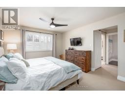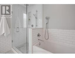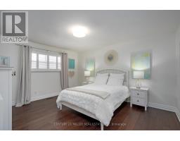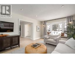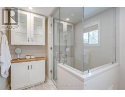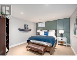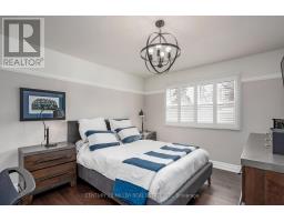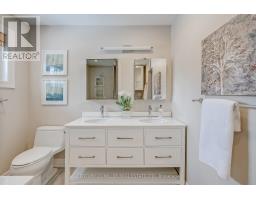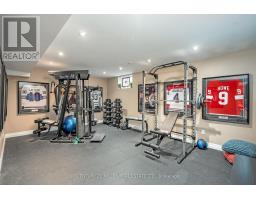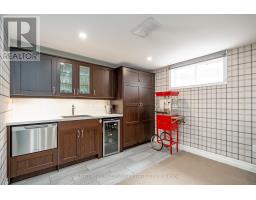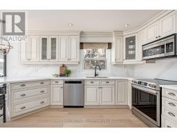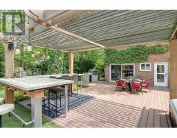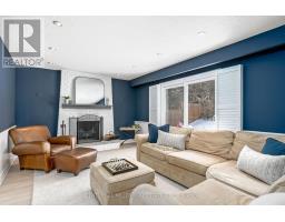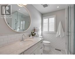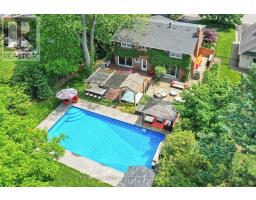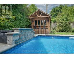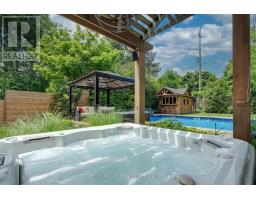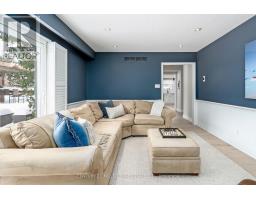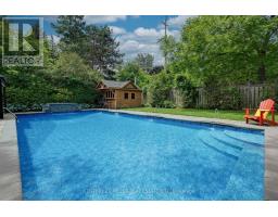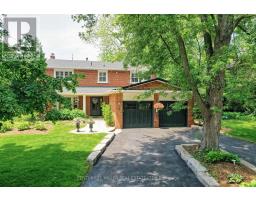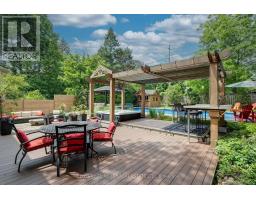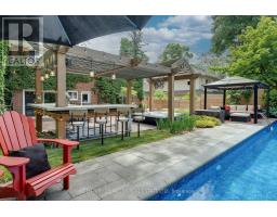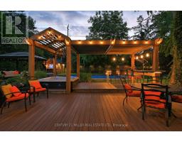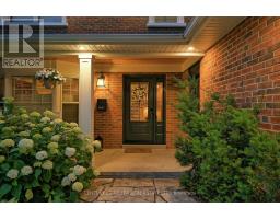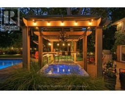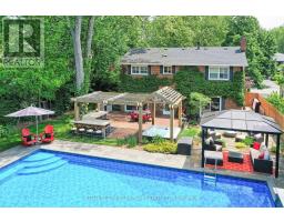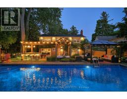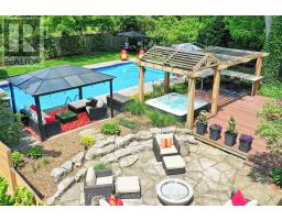 Located south of Lakeshore Road in a prestigious enclave of Ford, this executive family home blends traditional comfort with contemporary refinement. Set back on a mature lot framed by evergreens, it's a short stroll to the shores of Lake Ontario and positioned within a well-known, family-friendly pocket. A boulder-lined drive and flat stone pavers lead to the cedar-planked front portico, opening to a refined + cohesive interior. Expansive glazing fills the principal living spaces with natural light, complemented by detailed millwork, white oak hardwood flooring + neutral tile throughout. The living room features a picturesque bay window with upholstered seating, while the formal dining room is ideal for entertaining. A cozy wood-burning fireplace anchors the family room with serene rear garden views. The eat-in kitchen offers abundant custom cabinetry and a large glass slider for seamless access to the rear deck. A functional utility wing includes a mudroom, rear access + powder room. The primary retreat offers tranquil backyard views, full-wall built-in closets + a spa-inspired ensuite with oversized steam shower. Three additional bedrooms share a beautifully appointed main bath + second-level laundry adds everyday ease. Featured on HGTV, the lower level extends the home's refined living space with a stone-clad wood-burning fireplace, expansive rec room with projector and surround sound + an outfitted wet bar, ideal for gatherings. A gym + guest bedroom with semi-ensuite complete the level. The backyard unfolds like a private resort, anchored by a crisp rectangular pool, pergola-covered hot tub, outdoor kitchen, dining area, lounge pavilion + seated bar, all framed by natural stone terraces + mature greenery. Designed for both grand entertaining + quiet daily rituals, this is a sophisticated home with an immaculately private, resort-style backyard in one of Oakville's most family-focused neighbourhoods. (id:47351)