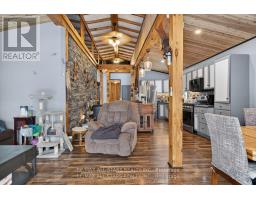 Welcome to this one-of-a-kind post-and-beam home, rich in character and warmth, set on approximately of an acre in a welcoming, family-oriented community near Shadow Lake. From the moment you arrive, wrap-around decks and mature surroundings set the tone for relaxed country living. Inside, soaring vaulted ceilings, exposed beams, and a stunning open-concept layout create an inviting space perfect for everyday living and entertaining. The main level offers 2 well-sized bedrooms, while the full walk-out basement features a bright family room, an additional bedroom, laundry area, and a versatile space currently used as a hair salon - ideal for a home-based business, studio, or hobby room. With a separate basement entrance, the lower level offers excellent potential to accommodate multigenerational living or extended family needs. Outdoors, the property truly shines with bountiful summer gardens, a peaceful pond, and a charming bunkie perfect for guests, teens, or creative space. Located just steps to Shadow Lake with access to a public beach and playground, and with a boat launch just up the street, this home offers a lake lifestyle without waterfront taxes. Conveniently situated minutes to Coboconk for shopping and amenities, approximately 35 minutes to Lindsay, and 40 minutes to Orillia - this is a rare opportunity to enjoy space, flexibility, and the best of Kawartha living. (id:47351)