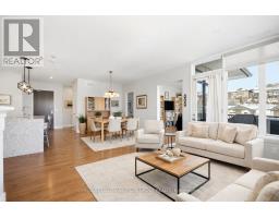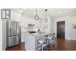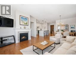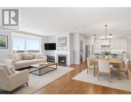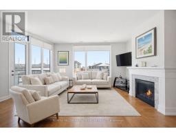 Welcome to The Elements at Richardson Ridge, an elegant residence located in the highly sought-after Kanata Lakes community. This luxurious top-floor unit offers approximately 1248 sqft of refined living space featuring 2 spacious bedrooms, 2 full bathrooms w/heated floors, & separate den, all enhanced by 9ft ceilings, rich hardwood flooring throughout, & oversized windows that flood the home w/natural light. The open-concept kitchen is both stylish & functional, showcasing a large eat-in island w/waterfall quartz countertops, white cabinetry, marble tile backsplash, & stainless steel appliances including a gas stove. The kitchen flows seamlessly into the bright living area, highlighted by a natural gas fireplace, creating an inviting space for both everyday living & entertaining. The primary suite is a true retreat, complete with a spa-inspired 4pc ensuite featuring double quartz vanities, a walk-in glass-walled shower, & a walk-through closet customized for optimal organization. A second bedroom w/picture window, a dedicated den/office, & convenient in-unit laundry with stacked washer & dryer complete the interior layout. Step outside to the top-floor private balcony, ideal for summer dining, complete with natural gas BBQ connection & breathtaking views of the Heritage Richardson House & the residents' private clubhouse. Additional features include 1 underground heated parking space,1 outdoor parking space, & a dedicated storage locker. The building is fully accessible, offering a large elevator and sloped ramps at the main entrance. EV charging is available, subject to board approval. Ideally located within walking distance to the Signature Centre & Kanata Centrum & Tanger Outlets Ottawa, & just steps from the 4 km Carp River Conservation Area, perfect for walking & biking. Close proximity to Kanata's North High-Tech District & the Canadian Tire Center adds to the appeal. Non-smoking condominium, including all units and common areas. Some photos virtually staged. (id:47351)