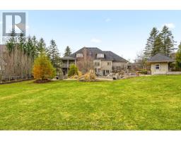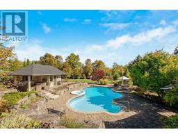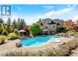 Stately bungaloft located at the end of a quiet cul-de-sac in sought-after Palomino Estates. This well-designed home offers a main-floor primary suite, a bright family room with a fireplace, and a kitchen and dining area overlooking the wrap-around porch and private natural surroundings. Large windows throughout provide excellent light and views of the property. The full walkout lower level adds valuable living space with a self-contained nanny/in-law suite, an additional bedroom, a full bathroom, and a dedicated theatre room. Ideal for multi-generational living or extended stays. The backyard is a standout feature, designed for both relaxation and entertaining. Enjoy a saltwater pool, hot tub, covered pavilion with a gas fireplace and TV, outdoor kitchen, fire pit area, and generous green space. Backing onto conservation land, the setting offers exceptional privacy and a peaceful connection to nature. Located minutes from Waterdown, Burlington, schools, golf courses, hiking trails, Glen Eden, and major highways. A rare opportunity to enjoy country living with convenient access to nearby amenities and recreation. Let's get you home! (id:47351)