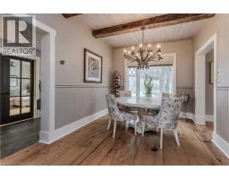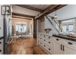Discover the perfect blend of rural charm and refined luxury on an exceptional property that offers the tranquility of country living while remaining just mins from Burlington’s everyday amenities, schools, shopping, and hwys. Set behind automated wrought iron gates is one of the most historic homes in the area originally from 1875. Inside, rustic character meets modern comfort. A welcoming foyer with heated floors sets the tone, while beautiful 1875 wood floors (2020), 8” baseboards, and designer lighting add warmth throughout. The heart of the home is the kitchen featuring concrete countertops, custom cabinetry, SS appliances, wood beam accents, tile backsplash, and a breakfast bar, seamlessly connecting to a bright breakfast area with a bay window. Multiple gathering spaces offer flexibility for living and entertaining, including a family room with stone-surround fireplace, formal dining room, and a living room with wood paneling, French doors, and a bay window. A main-floor bedroom and beautifully renovated 3pc bath with heated floors and glass shower provide ideal space for guests or multigenerational living. Upstairs, the expansive primary retreat impresses with vaulted 12’ ceilings, automated blinds, private balcony, and a custom California Closets walk-in. The spa-inspired ensuite features a freestanding tub, and glass walk-in shower. 2 additional spacious bedrooms and a stylish 4pc bath complete the level. The heated garage is a dream entertainment space, and offers polished concrete floors, automated blinds, and an EV charger rough-in. The partially renovated lower level provides excellent storage, laundry with new machines, a workbench, and walkout cellar doors. Outdoors, the fully fenced backyard is a true private retreat with a professionally landscaped stone patio, flagstone pathways, inground pool, hot tub, fire pit, and large shed—perfect for family gatherings, summer entertaining, and peaceful evenings under the stars. (id:47351)