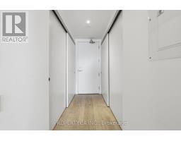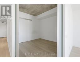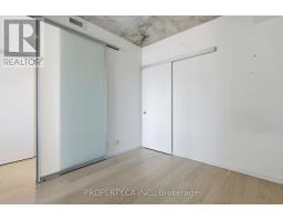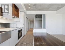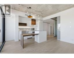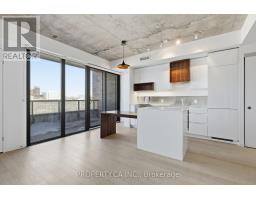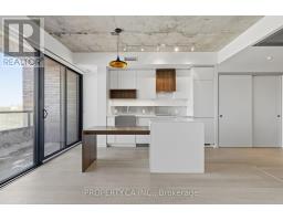Boutique loft-style living in the heart of Roncesvalles at 383 Sorauren Lofts. This sophisticated 1 bedroom, 1 bath suite offers a bright, open-concept layout with combined living and dining areas, featuring a custom built-in centre island with integrated dining table and private balcony. Soaring 9 ft exposed concrete ceilings create an authentic loft atmosphere, while hardwood floors flow throughout. The stylish designer kitchen boasts integrated high-end appliances, complemented by exceptional storage. A generous primary bedroom with sliding doors and semi=ensuite bath. Located in one of the neighbourhood's most desirable buildings, steps to transit, High Park, and Roncesvalles' vibrant cafes and restaurants. (id:47351)